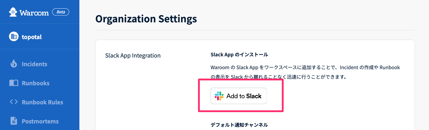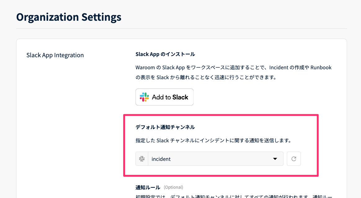 組織の設定画面の「デフォルト通知チャンネル」からインシデントに関連する通知を受け取りたいチャンネルを選択します。