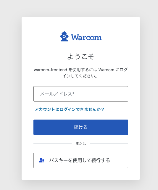 Waroom にログインをするにはメールアドレスとパスワードの入力を行います。app.waroom.comからログインを押下すると以下の画面に遷移いたします。メールアドレスを入力後、パスワードを入力し、続けるを押下してください。