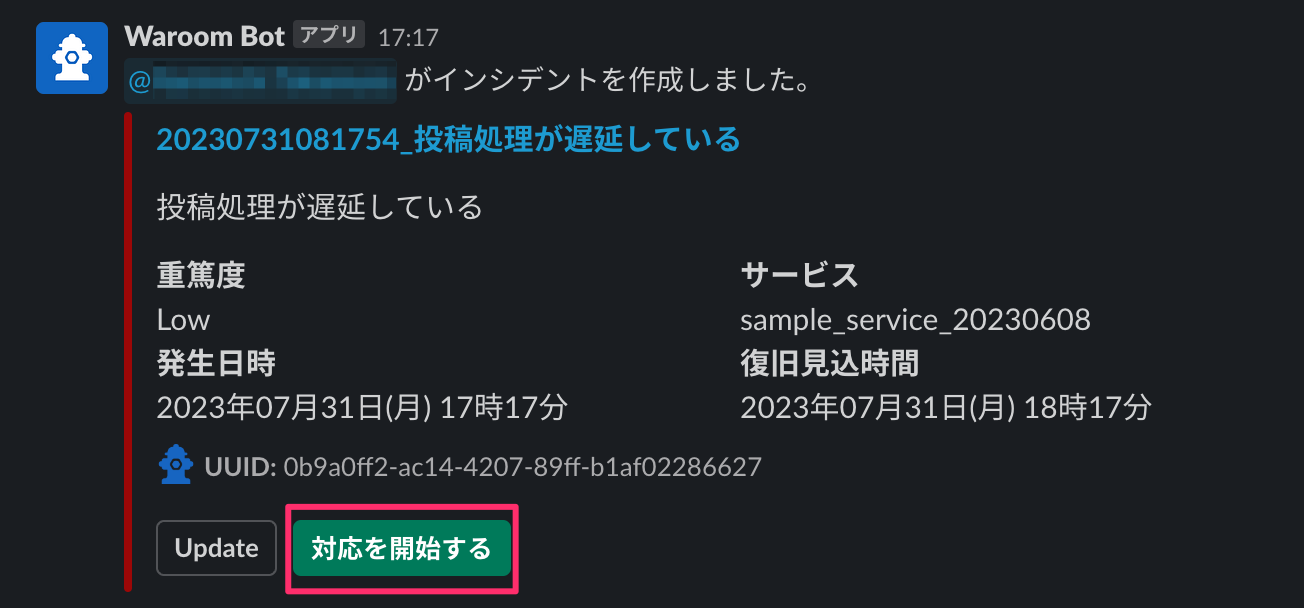 手動でインシデントを起票した場合は自動的にチャンネルが作成されます。インテグレーションから自動起票された場合は「対応を開始する」ボタンから専用チャンネルを作成します。作成した対応専用チャンネルに関係者を集めコミュニケーションを開始しましょう。