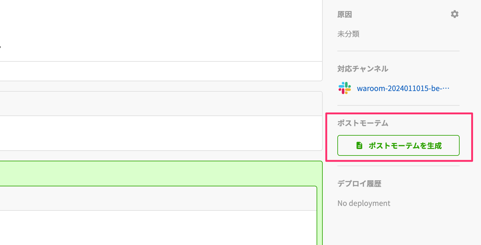 インシデントの対応内容からポストモーテムの下書きを生成できます。対象のインシデントの詳細画面の「ポストモーテムを生成」のボタンを押して生成を行ってください。(10秒ほどかかります)