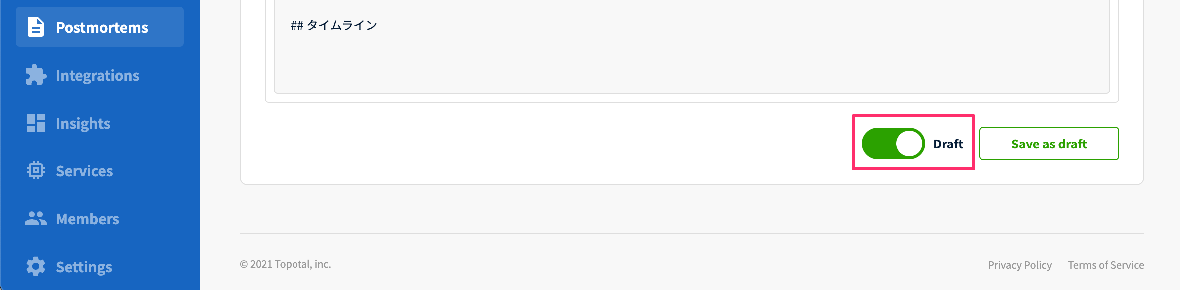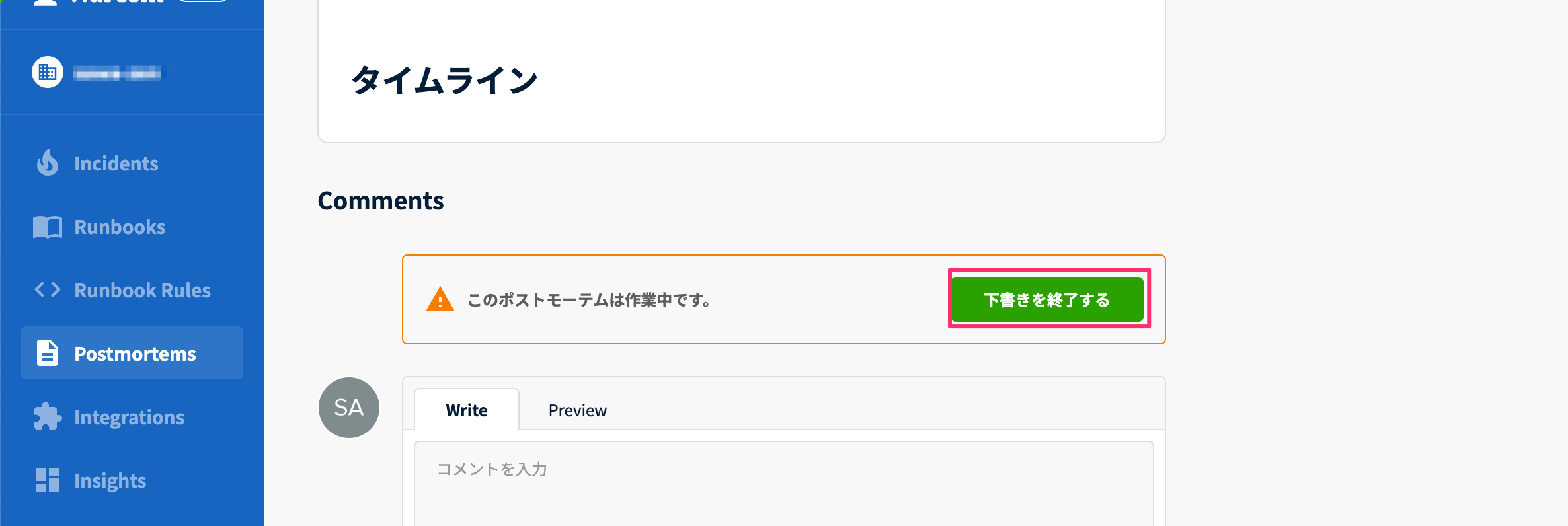 下書きを終了するにはポストモーテム詳細画面の「下書きを終了する」を押します。下書きラベルがはずれ通知チャンネルにてポストモーテムが作成された通知が届きます。