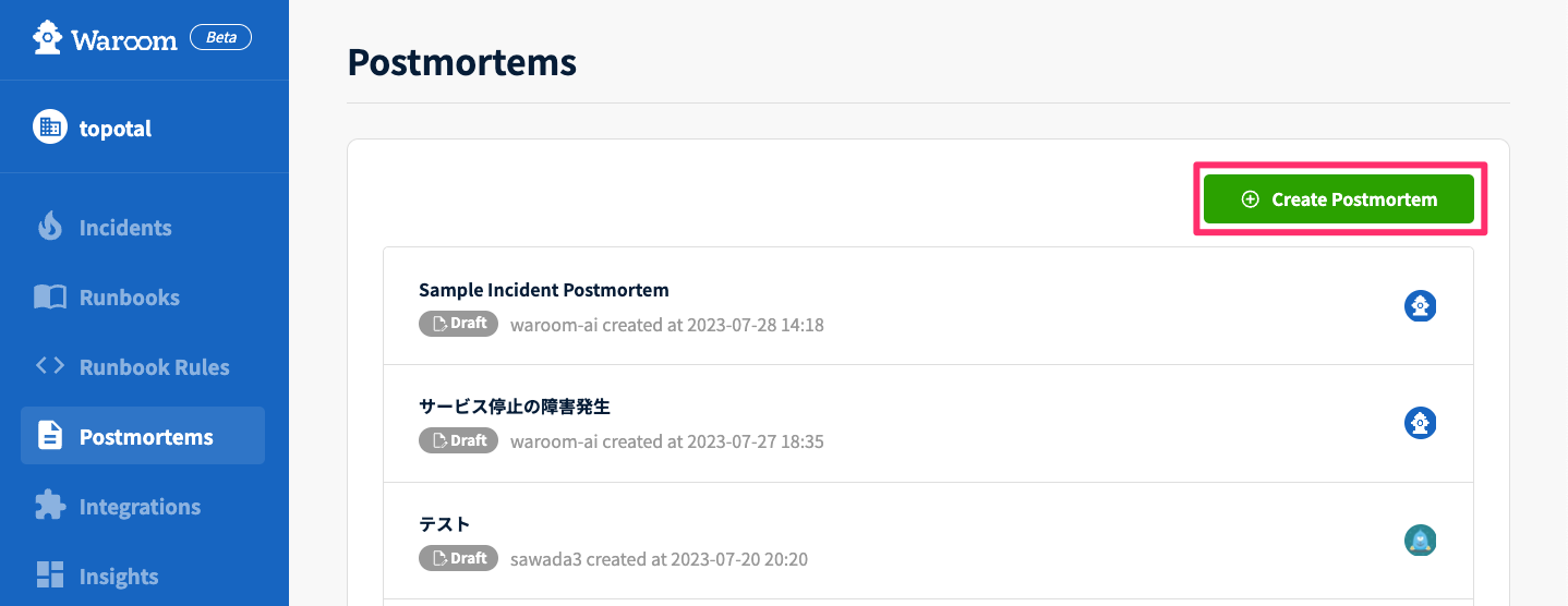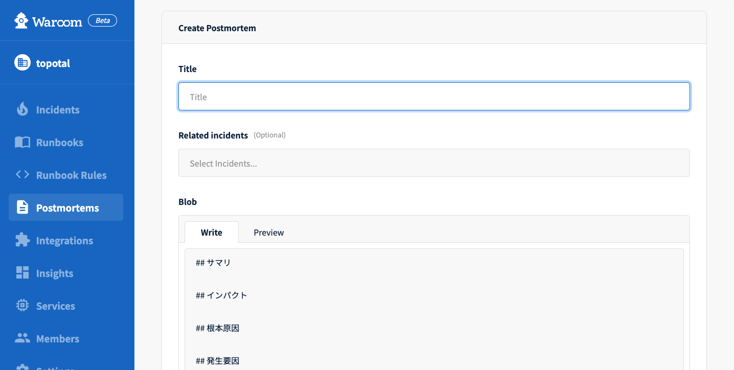 ポストモーテムはチームでのインシデント振り返りをする上で重要なドキュメントです。Waroom ではポストモーテムをインシデントに紐づけて作成することができます。